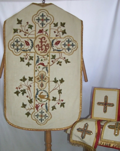 Ornement blanc 2 : chasuble, bourse du corporal, étole, manipule, voile du calice,
