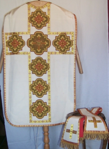 Ornement blanc 4 : chasuble, étole, manipule, voile de calice,