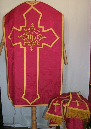 Ornement rouge 2 : chasuble, étole, manipule, voile de calice,