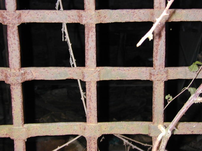 Détail : façade sud, fenêtre du rez-de-chaussée, grille à fer plat portant des motifs gravésImmatriculation
