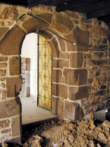 Détail : rez-de-chaussée, salle est, porte en plein-cintre remontée dans un mur moderne ; noter la présence des têtes sculptées, 16e siècleImmatriculation