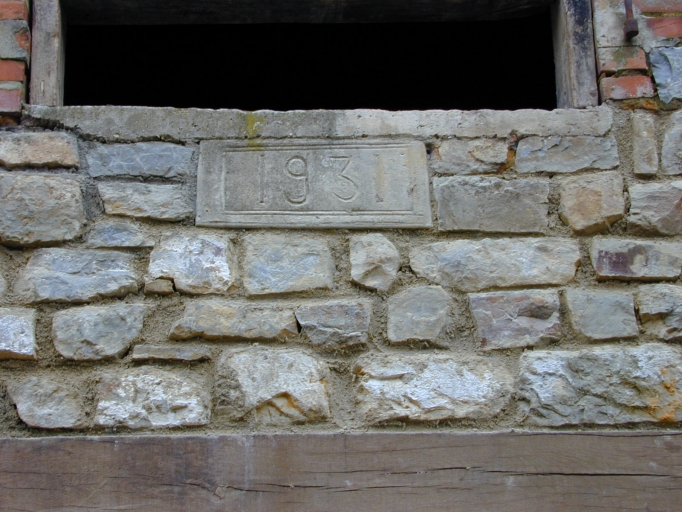 L'étable, plaque de ciment portant la date 1931: détailImmatriculation