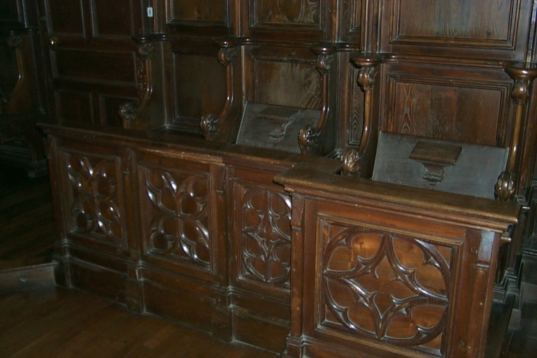 Ensemble d'un lambris de demi-revêtement, 2 niches-crédences et de 2x6 stalles,