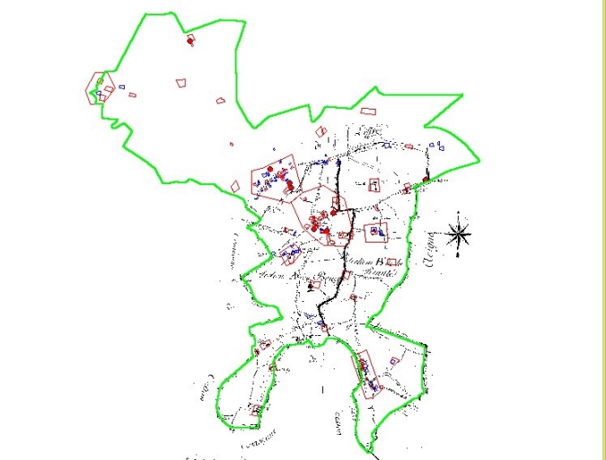 Les ouvrages recensés projetés sur le territoire communal en 1818 augmenté de Fouillard au nord-ouest en 1981Immatriculation