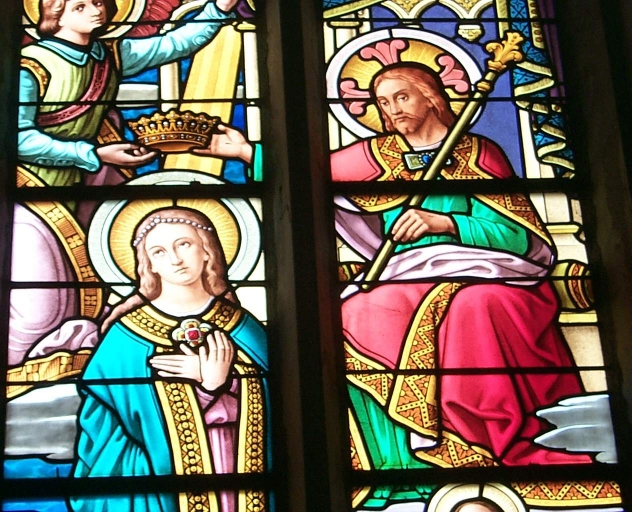 Ensemble des 3 verrières à personnages des baies 0 à 2 : Couronnement de la Vierge, Prédication et mort de saint Melaine,