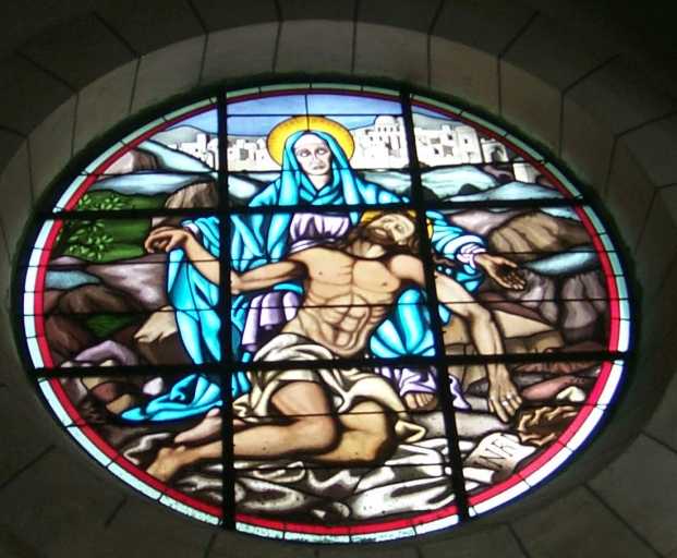 Ensemble des 2 verrières à personnages des baies 5 et 6 : Calvaire et Déposition,