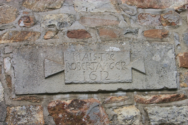 Pierre gravée d'inscriptions enchâssée dans la façade du logisImmatriculation