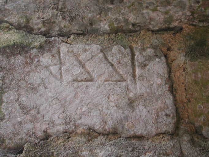 Détail : pierre datée 1774, remployée dans le mur de la grangeImmatriculation