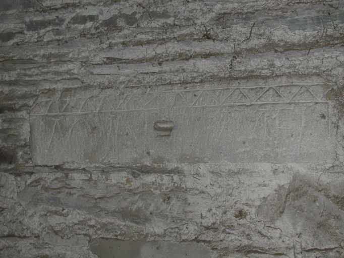 Détail : pierre ancienne (16e siècle ?) remployé dans le mur de la grangeImmatriculation