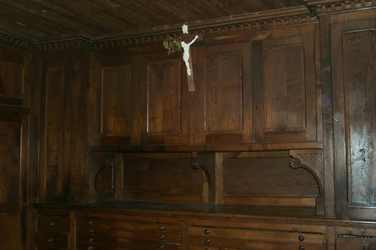 Ensemble des meubles de la sacristie : chasublier, 12 armoires,