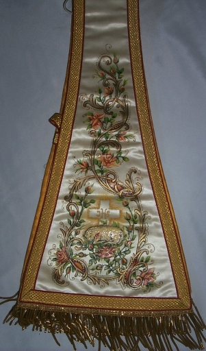 Ornement blanc 2 : chasuble, bourse du corporal, étole, manipule, voile du calice,