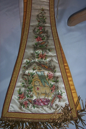 Ornement blanc 2 : chasuble, bourse du corporal, étole, manipule, voile du calice,