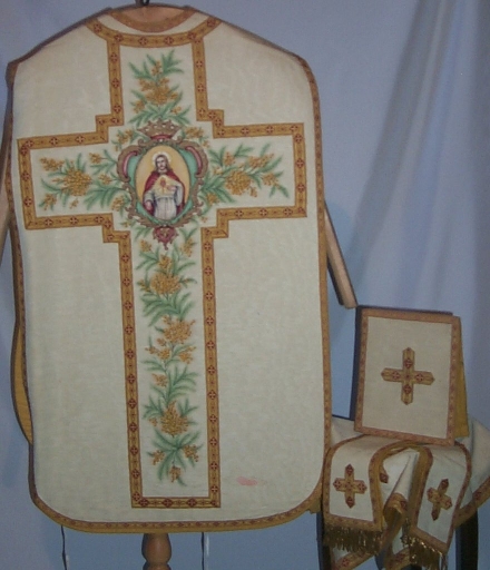 Ornement blanc 4 : chasuble, bourse du corporal, étole, manipule, voile du calice,