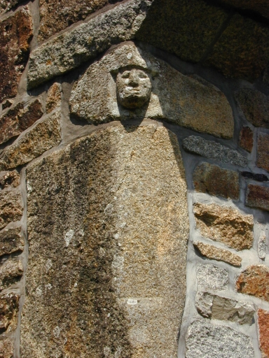 Détail : mur sud, pierre en remploi avec tête sculptéeImmatriculation