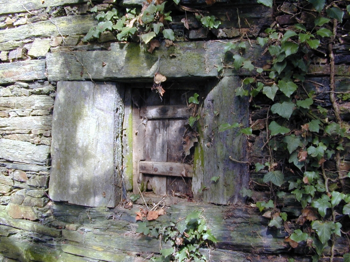 Petite fenêtre fermée par son volet de bois : vue générale sudImmatriculation