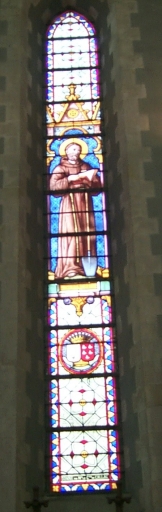 Ensemble des verrières à personnages des baies 0 à 4, 7, 8 : Vierge à l'Enfant, sainte Elisabeth, saints André, Jean-Baptiste, Maurice, Fiacre et Joseph,