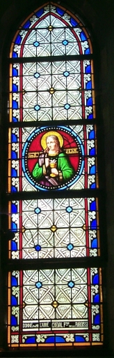 Ensemble des verrières à personnages des baies 9 à 16 : sainte Anne, saints Alphonse, Jean, Louis, Marc, Julien, Baptème du Christ,