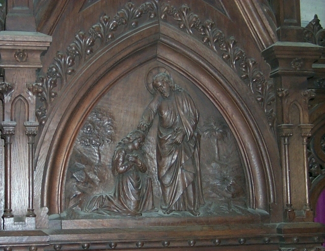 Confessionnal sud, décor du fronton : Jésus et Marie-MadeleineImmatriculation