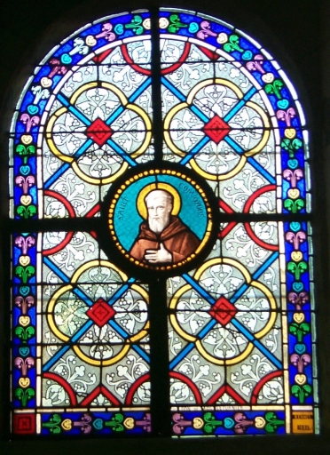 Ensemble des verrières à personnages des baies 1 à 8, 10 : saint Joseph, sainte Anne, saint Convoyon, saint Jean-Baptiste, Vierge de douleur, saint Pierre,