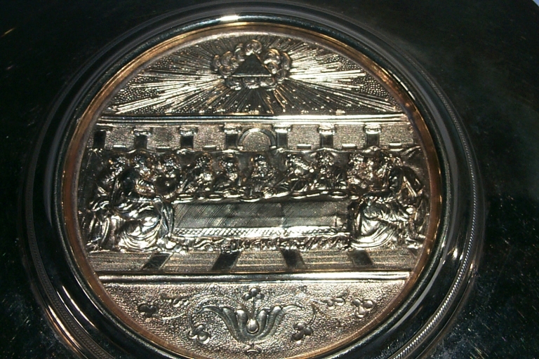 Chapelle et sa boîte : calice, patène, 2 burettes et leur plateau,