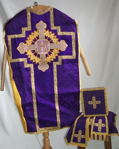 Ornement violet 1 : chasuble, bourse de corporal, étole, manipule, voile de calice,