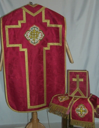 Ornement rouge 2 : chasuble, bourse de corporal, étole, voile de calice, manipule,