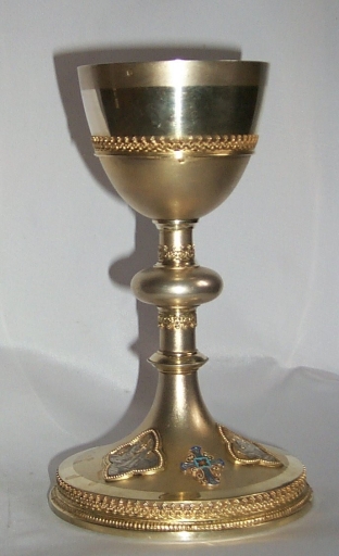 Chapelle et sa boîte : calice, patène, 2 burettes et leur plateau, clochette,