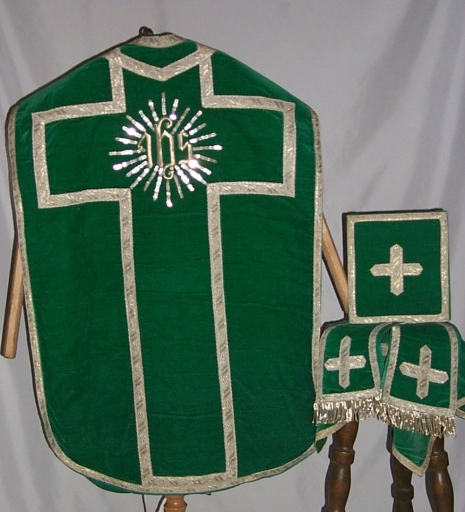 Ornement vert 1 : chasuble, bourse de corporal, étole, manipule, voile de calice,