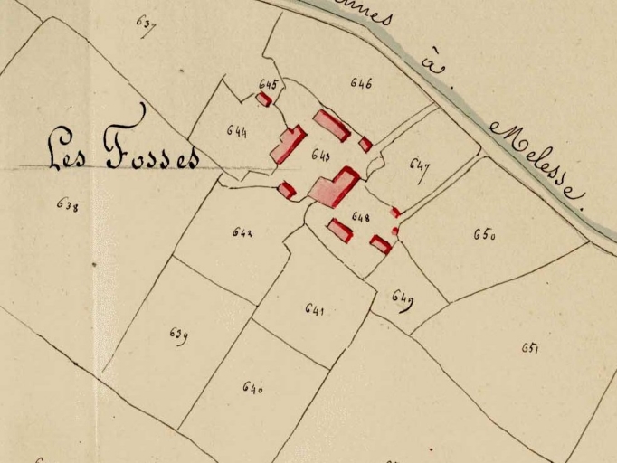 Extrait du cadastre de 1819, section B2. Le manoir et sa cour est sur la parcelle 648, la ferme et sa cour, au nord,or en 643.Immatriculation