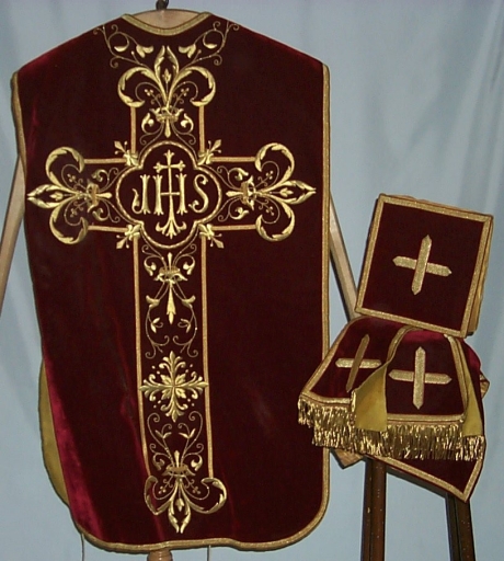 Ornement rouge 1 : chasuble, bourse de corporal, étole, manipule, voile de calice,