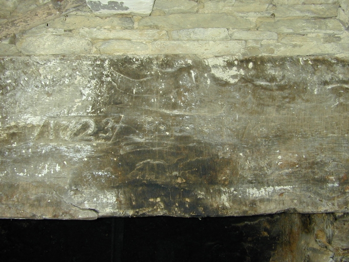 Intérieur, linteau de la cheminé gravé d'inscriptions : détailImmatriculation