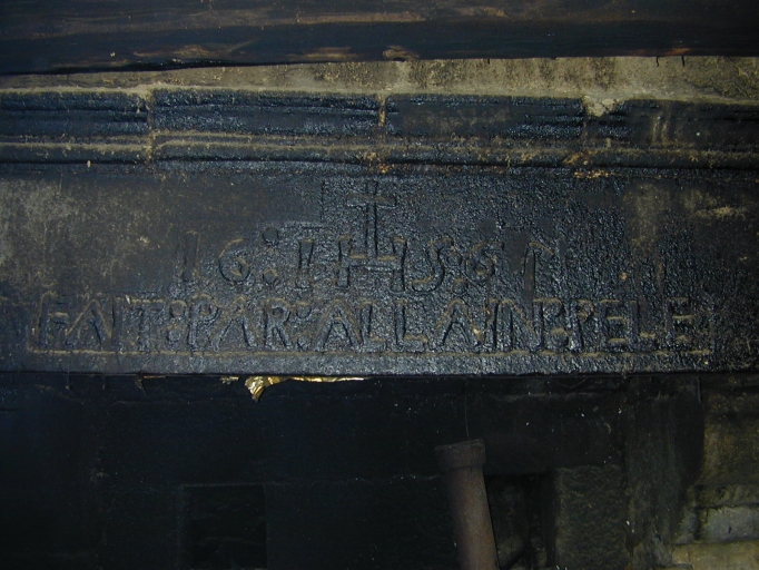Intérieur, cheminée de la salle : détail du linteau épigraphiqueImmatriculation