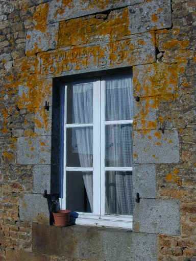 Façade antérieure, fenêtre médiane gravée d'inscriptions : détailImmatriculation