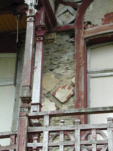 Détail de la mise en oeuvre du décor en pan de bois, vue du mur en moellons de schisteImmatriculation