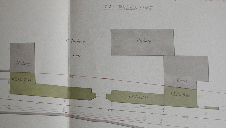 Plan masse de 1879, indiquant le nombre de niveaux et les matériaux de construction de l'édificeImmatriculation