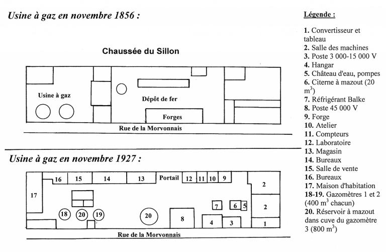 Plans de l'usine à gaz : son état en 1856, et en 1927.Immatriculation