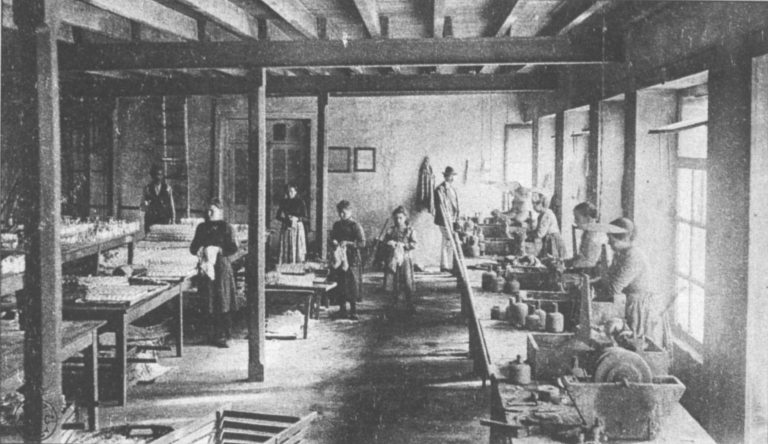 Vue intérieure du magasin de la verrerie (atelier d'empaquetage) où les femmes empaillaient les verres, puis les empaquetaient.Immatriculation