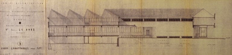 Reconstruction de la Nouvelle Beurrerie d'Ille-et-Vilaine, coupe longitudinale est (janvier 1947).Immatriculation