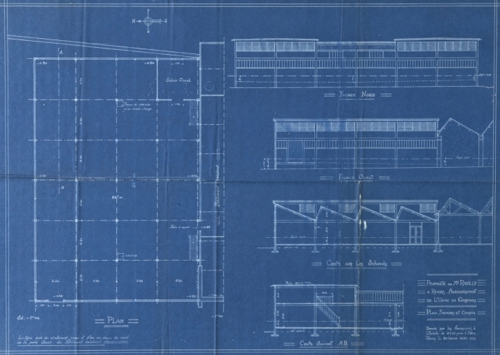 Elévations nord et ouest ; coupe transversale sur les sheds (20 juin 1920).Immatriculation