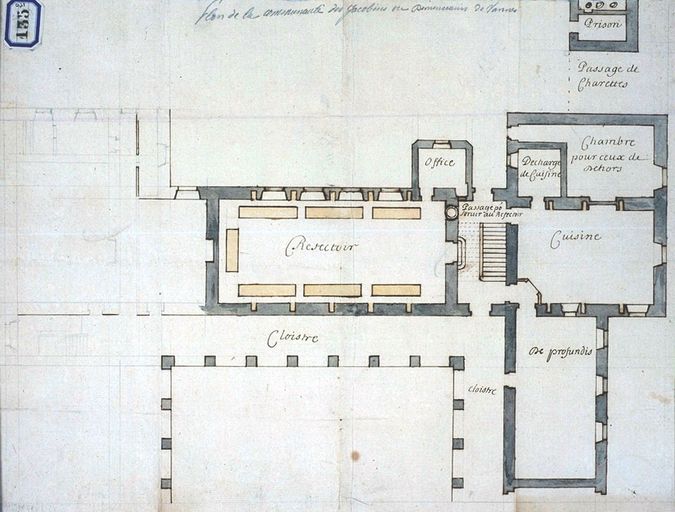 Plan du rez-de-chaussée du couvent des dominicains, 18e siècle. AD Morbihan 1Fi 135/2.Immatriculation