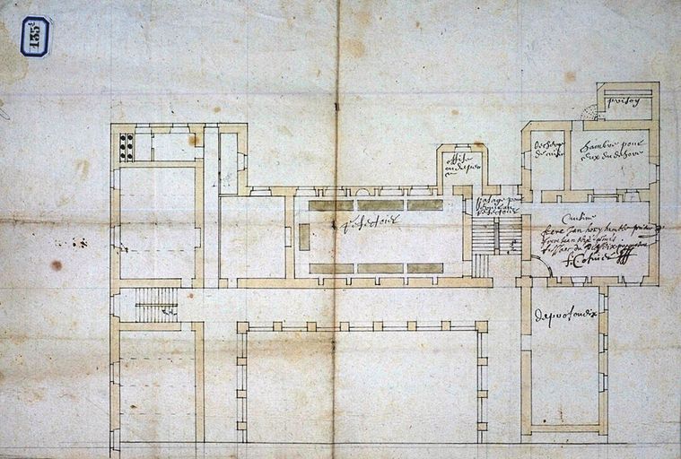 Plan du rez-de-chaussée du couvent des dominicains par François Cosnier, 4e quart 17e siècle. AD Morbihan 1Fi 135/3.Immatriculation