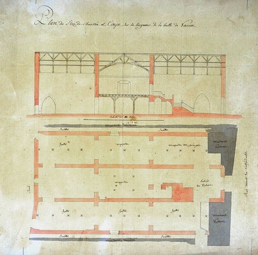 Plan du rez-de-chaussée et coupe sur la longueur des halles, fin 18e siècle. AD Morbihan 1 Fi 145/2.Immatriculation