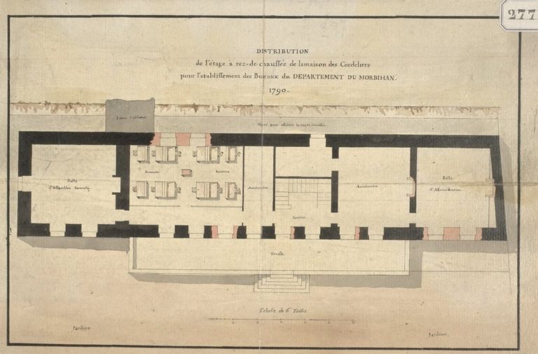 Maison des Cordeliers : distribution de l'étage et du rez-de-chaussée pour l'établissement des bureaux du département du Morbihan, 1790. AD Morbihan 1 Fi 277.Immatriculation