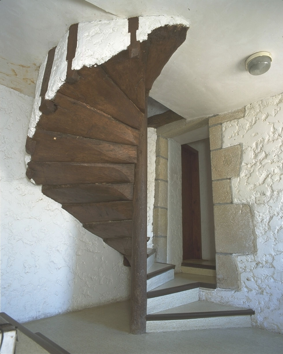 Escalier en vis desservant la chambre haute (cage à demi-fermée).Immatriculation
