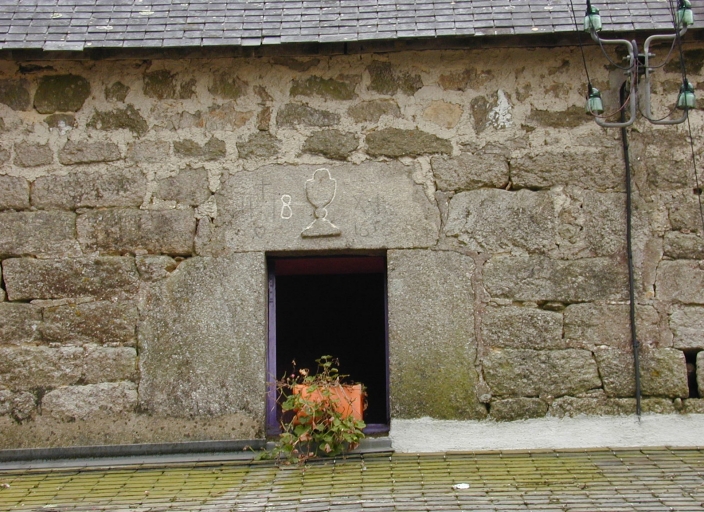 Kergoff. Maison de prêtre ?, inscription sur linteau de la fenêtre postérieure : calice, 1656, IHS, croix, coeur, AM.Immatriculation
