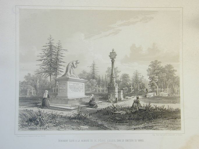Vue générale du cimetière. Monument élevé à la gloire du Père Leleu. Lithographie, imprimerie de Lamarzelle, Vannes, fin 19e siècle. AD Morbihan.Immatriculation