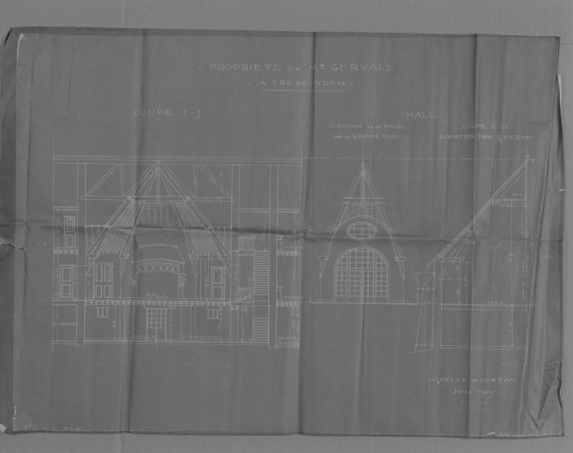 Propriété de M. Gervais à Trébeurden, coupes I-J (sur le hall), H-O (élévation d'une demi-ferme) et élévation de la face de la grande baie, par Louis Süe et Paul Huillard, juin 1909Immatriculation