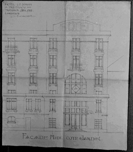 Hôtel Le Bihan à Trestraou. Travaux 1924-1925. Façade midi côté jardin, tirage sur papier, par Georges Robert Lefort, architecte, 1924-1925 (AD 22)Immatriculation
