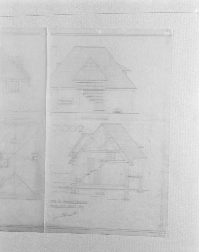 Façade arrière, coupe, crayon sur calque, par James Bouillé, architecte, février 1933.Immatriculation