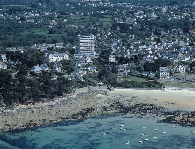 Vue aérienne de la plage de Pors Termen et du plateau avec l'immeuble HéliosImmatriculation